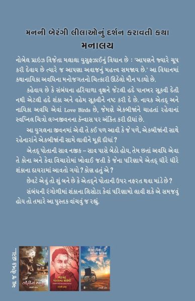 Manalay by Rajni Patel | Gujarati Novel book.મનાલય - લેખક : રજની પટેલમનના દર્પણમાં નહીં ઝિલાયેલા દશયો ની મૌન કબૂલાત. મનની બેરંગી લીલાઓનું દર્શન કરાવતી કથાઃ મનાલયનોબેલ પ્રાઇઝ વિજેતા મલાલા યુસુફઝાઈનું વિધાન છે : ‘આપણને જ્યારે ચૂપ કરી દેવાય છે ત્યારે જ આપણા અવાજનું મહત્ત્વ સમજાય છે.’ આ વિધાનમાં કથાનાયિકા અવધિના મનોજગતનો ચિત્કારી ઊઠેલો મૌન પડઘો છે.કહેવાય છે કે સંબંધના હરિયાળા વૃક્ષને જેટલી હદે પાનખર સૂકવી દેતી નથી એટલી હદે શંકા અને વહેમ સૂકવીને નષ્ટ કરી દે છે. નાયક એતદ્ અને નાયિકા અવધિ એવાં Love Birds છે, જેમણે એકબીજાંને ચાહતાં રહેવાનાં સ્વપ્નિલ ચિત્રો લગ્નજીવનના કૅન્વાસ પર અંકિત કરી દીધાં છે.આ યુગલના જીવનમાં એવી તે કઈ પળ આવી કે જે પળે, એકબીજાંની સાથે રહેનારાંને એકબીજાંની સામે લાવીને મૂકી દીધાં? એતદ્ પોતાની સાવ નજીક – સાવ પાસે બેઠો હોય, તેમ છતાં અવધિ એવા તે કોના અને કેવા વિચારોમાં ખોવાઈ જતી કે જેના પરિણામે એતદ્ ધીરે ધીરે શંકાના દાયરામાં આવતો ગયો? કોણ હતું એ?છેવટે એવું તો શું બને છે કે એતદ્ને પોતાની ઉપર નફરત થવા માંડે છે?સંબંધની રંગોળીમાં શંકાના લિસોટા કેવાં પરિણામો લાવી શકે એ સમજવું હોય તો તમારે આ પુસ્તક વાંચવું જ રહ્યું. |