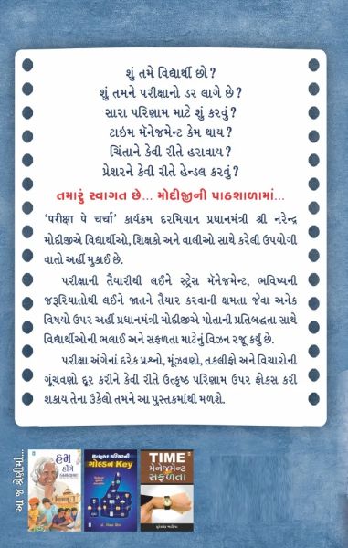 Modijini Pathsala by Mahesh Dutt Sharma | Gujarati Education book.મોદીજી ની પાઠશાળા - લેખક : મહેશ દત્ત શર્માશું તમે વિદ્યાર્થી છો? શું તમને પરીક્ષાનો ડર વાગે છે? સારા પરિણામ માટે શું કરવું? ટાઇમ મૅનેજમેન્ટ કેમ થાય? ચિંતાને કેવી રીતે હરાવાય? પ્રેશરને કેવી રીતે હેન્ડલ કરવું? તમારું સ્વાગત છે... મોદીજીની પાઠશાળામાં... પરીક્ષા પે ચર્યા કાર્યક્રમ દરમિયાન પ્રધાનમંત્રી શ્રી નરેન્દ્ર મોદીજીએ વિદ્યાર્થીઓ, શિક્ષકો અને વાલીઓ સાથે કરેલી ઉપયોગી વાતો અહીં મુકાઈ છે.પરીક્ષાની તૈયારીથી લઈને સ્ટ્રેસ મૅનેજમેન્ટ, ભવિષ્યની જરૂરિયાતોથી વઈને જાતને તૈયાર કરવાની ક્ષમતા જેવા અનેક વિષયો ઉપર અહીં પ્રધાનમંત્રી મોદીજીએ પોતાની પ્રતિબદ્ધતા સાથે વિદ્યાર્થીઓની ભવાઈ અને સફળતા માટેનું વિઝન રજૂ કર્યું છે.પરીક્ષા અંગેનાં દરેક પ્રશ્નો, મૂંઝવણો, તકલીફો અને વિચારોની ગૂંચવણો દૂર કરીને કેવી રીતે ઉત્કૃષ્ઠ પરિણામ ઉપર ફોકસ કરી શકાય તેના ઉકેલો તમને આ પુસ્તકમાંથી મળશે. |