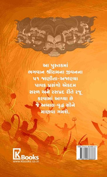 Shri Ram Ekavan by Viral Vaishnav | Gujarati book about 51 moral life incidents of Lord Ram.શ્રી રામ એકવાન - લેખક : વિરલ વૈષ્ણવભગવાન શ્રી રામ ના ૫૧ પાવક પ્રસંગો. આ પુસ્તકમાં ભગવાન શ્રીરામનાં જીવનના 51 પાવક પ્રસંગોને અબાલવૃદ્ધ કોઈપણ માણી શકે તે રીતે રજૂ કરવામાં આવ્યા છે. આ પુસ્તકની વિશેષતા એ છે કે ભગવાન શ્રીરામનાં જીવનના જાણીતા પ્રસંગોમાં પણ કેટલીક અજાણી માહિતી આપવામાં આવી છે, તો સાથે ભગવાન શ્રીરામનાં જીવનના ઓછા જાણીતા પ્રસંગોનો પણ સમાવેશ કરવામાં આવ્યો છે. પુસ્તકના લેખન માટે વાલ્મીકિ રામાયણ, તુલસીકૃત રામાયણ ઉપરાંત વાયુ, વિષ્ણુ, કુર્મ, સ્કંદ, ભાગવત, અગ્નિ, ભવિષ્ય, બ્રહ્મ, બ્રહ્મવૈવર્ત, નારાયણ, નારદીય, દેવીભાગવત, મહાભાગવત, વિષ્ણુ અને ખાસ તો પદ્મપુરાણમાં રજૂ થયેલાં ભગવાન શ્રીરામનાં જીવનના દિવ્ય પ્રસંગોને ટૂંકમાં છતાં પૂરતી વિગતો સાથે આલેખવામાં આવ્યાં છે. પ્રસંગો એ રીતે રજૂ કરવામાં આવ્યા છે કે મોટાભાગની વાર્તાઓ બાળકોને પણ વાંચીને સંભળાવી શકાય. નવી પેઢીને ભગવાન શ્રીરામ વિશે વાર્તાઓ કહેવી હોય તો આપણી યાદશક્તિમાં જેટલી સચવાયેલી હોય તેટલી જ વાતો કહી શકીએ, જ્યારે આ પુસ્તક બાળકોને ભગવાન શ્રીરામના જીવનનાં પ્રસંગો વર્ણવવા માટે હાથવગું બની રહે તેમ છે. પુસ્તકમાં ભગવાન શ્રીરામનાં પરાક્રમો અને લીલાઓ છે, સાથે ઉપદેશ પણ વાર્તાના ભાગરૂપે જ એકદમ સરળતાથી વણી લેવામાં આવ્યો છે. પુસ્તકને શ્રીરામનાં વિવિધ સ્વરૂપોનાં ચિત્રોથી સજાવવામાં પણ આવ્યું છે. છે.. |