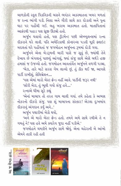 Tari Aankhoma by Varsha Adalja | Gujarati Short Stories book.તારી આંખોમાં - લેખક : વર્ષા અડલજાસત્યનાં બીજમાંથી પાંગરેલી કથાઓ. બાળકોની સ્કૂલ પિકનિકની બસને ભયંકર અકસ્માતના ખબર મળતાં જ રત્ના ભાંગી પડી. નિશા અને ગૌરી સાથે કાર દોડાવી અને પુના ઘાટ પર પહોંચી ગઈ. બહુ ખરાબ અકસ્માત હતો. માતાપિતાનાં આકંદથી પહાડ પણ પૂજી ઊઠ્યો હતો.અર્જુન ધવાયો હતો, પણ ટ્રીટમેન્ટ પછી ઍમ્બ્યુલન્સમાં રત્ના દીકરાને ઘરે લાવી. પતિ અમેરિકાથી કૉન્ફરન્સ પડતી મૂકી ફ્લાઇટ બદલતાં ઘરે પહોંચતાં જ જગમોહન અર્જુનના રૂમમાં દોડી ગયા.અર્જુનને એના બેડરૂમની બારી પાસે જ સૂવું છે, જ્યાંથી તેને દેખાય છે બંગલાનું પાછવું આંગણું, જ્યાં સંજુ સાથે એણે બર્થડે હજી હમણાં જ ઉજવ્યો હતો. જગમોહન આવતાંવેંત અર્જુનને વળગી પડ્યા, |