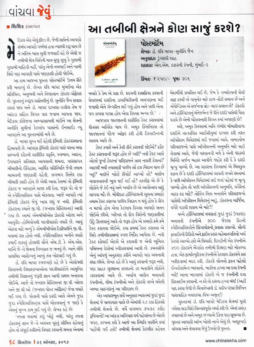Postmortem by Doctor Ravi Bapat- Suniti Jain Translated by Dungarshi Shah આ પુસ્તકમાં ડૉ રવિ બાપટે મેડીકલ ક્ષેત્રમાં ઘુસી ગયેલા સડા વિશે વિસ્તાર પૂર્વક ચર્ચા કરીછે. ડોક્ટરો અને દવા કપનીઓનોની સાઠગાંઠ વિશે વાંચશો તો તમારી આંખો પહોળી થઇ જાશે. |